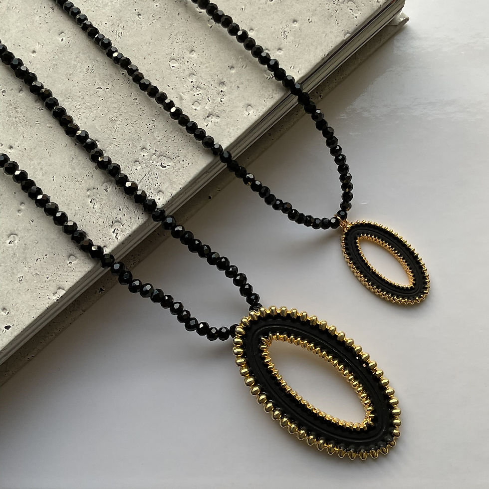 Collar largo de pequeñas bolas rojas con pieza central de zamak en dorado mate.